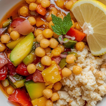 Piatto unico con verdure, ceci e olio al limone